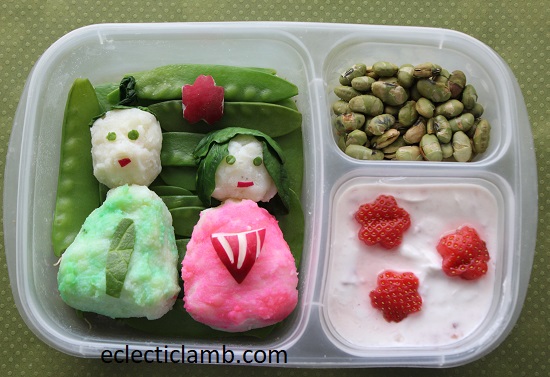 Left Side: Dove – cooked Nishiki rice pressed into a cookie cutter, cheddar cheese broiled on top of the rice. Eye – spinach cut with a mini cutter, roasted asparagus