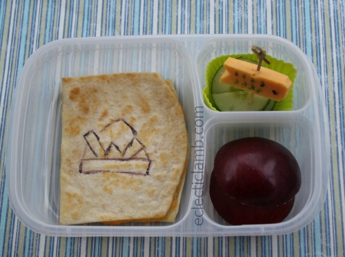 Right Side: Pirate Ship – cheese quesadilla, chocolate Lego man, fruit flat pirate hat with sprinkles details, blueberries