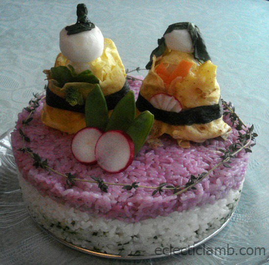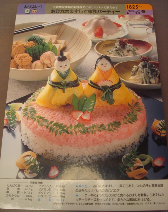 - Hinamatsuri Rice Cake – I copied the Ohinasama Sushi image from ‘with Cooking Cards’. ISBN4-06-187736-4. See below for directions.