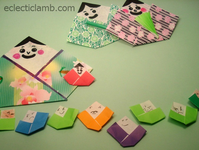 I found simple crafts that reinforced the cultural symbols of Hinamatsuri. We made a lot of simple origami Emperors. The kids decorated some faces as crying, angry, and laughing faces. These are for the three habits represented on the 5th tier of the doll display.