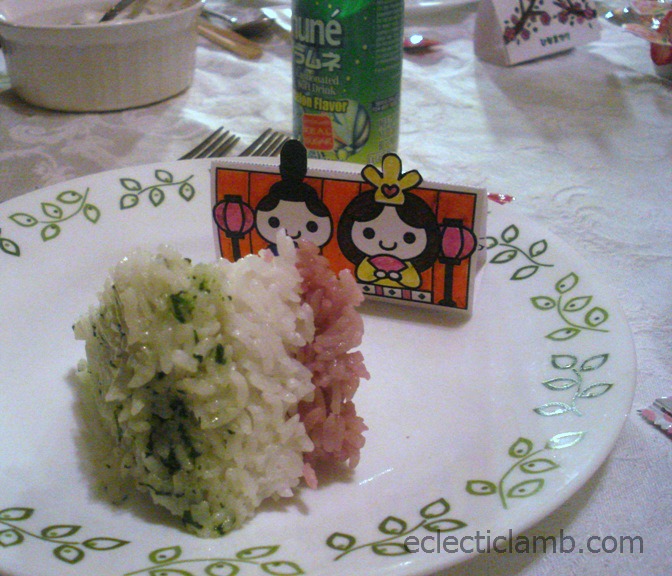 - Hinamatsuri Pudding – I made and layered pistachio pudding, whipped cream, and vanilla pudding (with some red food coloring).