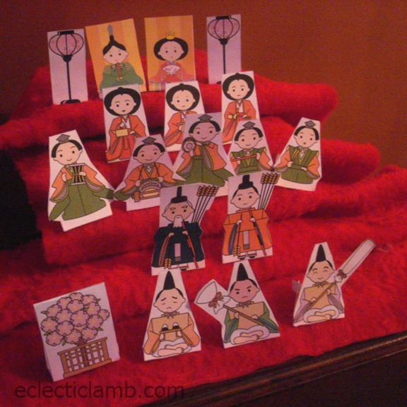 - Paper Hinamatsuri dolls on a tiered display – I printed these onto card stock, cut-out, and assembled.