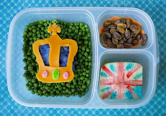 Left Side: St Edward’s Crown – Cheddar cheese cut with a cookie cutter, details cut with knife, jewels cut with oval cookie cutter, painted with food coloring, Purple – mashed potato with butterfly pea powder, peas